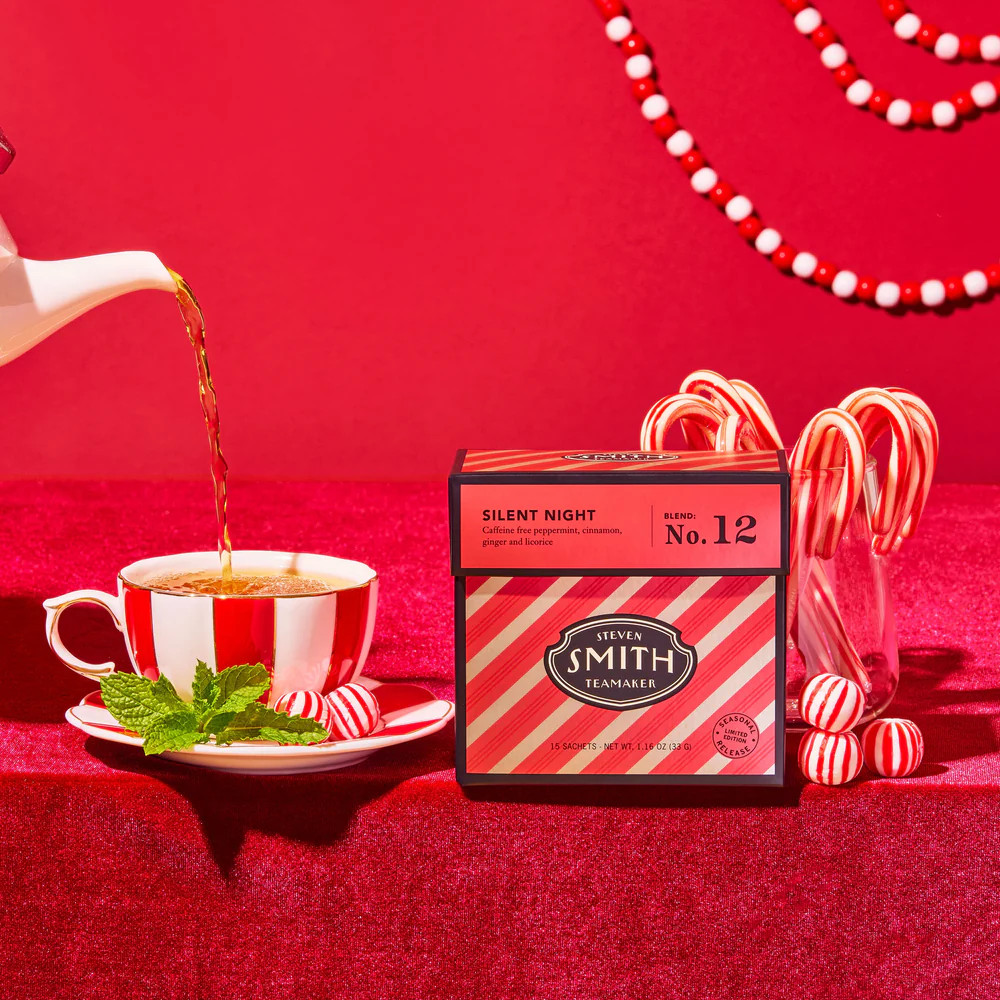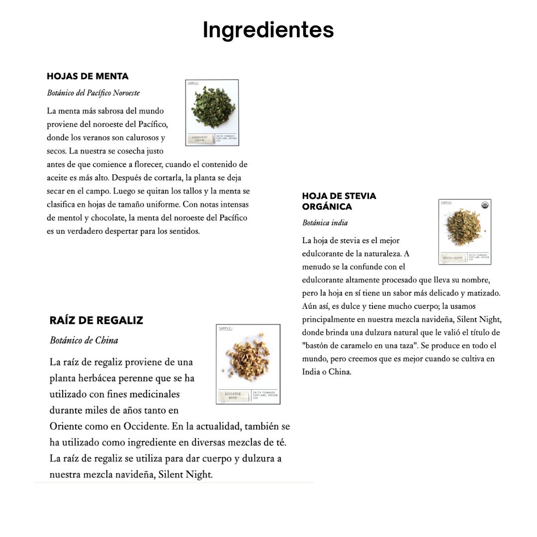 A caffeine-free candy cane in a cup. Northwest-grown peppermint leaves dancing in a winter wonderland of cinnamon, ginger, and sweet licorice. Tastes especially delicious when the weather outside is frightful.